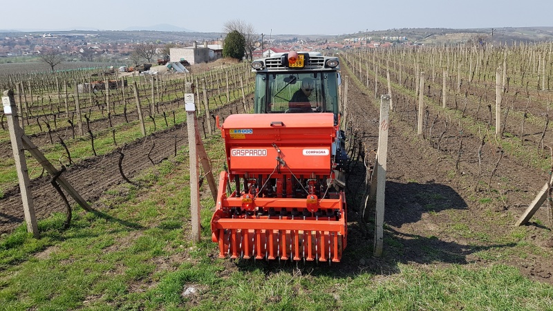 Jedna z podmínek integrované produkce je vysetí druhotně bohaté travní směsi do každého druhého meziřadí vinice. Pořídili jsme nový secí stroj a setí provádíme službou i našim kolegům vinařům.
